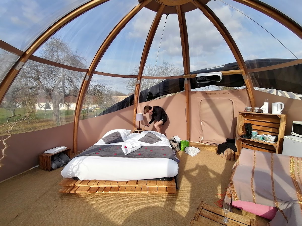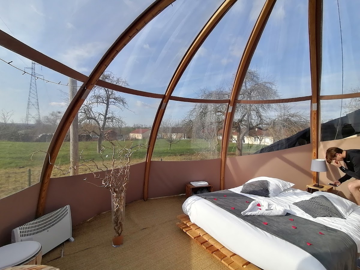 Weekend excellent, à 2 pas de la madine dans une bulle "Cerise" magnifique. Lit double bien décoré, vaisselle à disposition, frigo, Bouilloir, cafetière, micro onde, bouteille de bienvenue avec madeleine de commercy, canapé, coin salon, climatisation... Spa privatif. "Pas de vis-à-vis." Un moment idéal ! Une nuit magnifique à voir les étoiles Les propriétaires super sympa Le petit déjeuner est prêt devant la bulle à 8h30 Nous avons pris un massage, c'était vraiment très agréable. Je vous recommande ! Un food truck très beau, les propriétaires font tout maison. C'est trop bon et des assiettes bien garni Les sanitaires sont toujours propre. Je vous recommande fortement la bulle "Cerise" !!! Nous sommes répartis reposer et détendu de notre week-end A bientôt